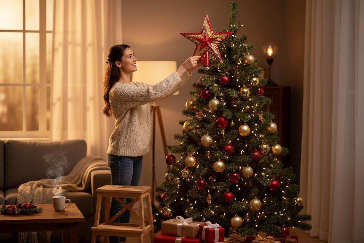Este echipat cu suport conic pentru montare stabila in partea superioara a bradului, fiind compatibil cu majoritatea brazilor naturali sau artificiali. Culorile vibrante rosu-auriu se potrivesc perfect cu temele festive traditionale.