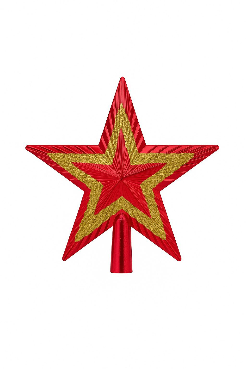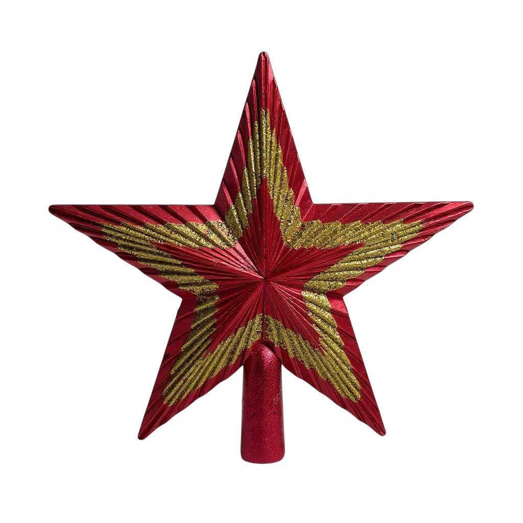Varf decorativ pentru brad in forma de stea rosie cu model auriu aplicat central. Realizat din material plastic usor, cu finisaj lucios si detalii texturate, varful adauga un plus de stralucire si eleganta oricarui brad de Craciun.