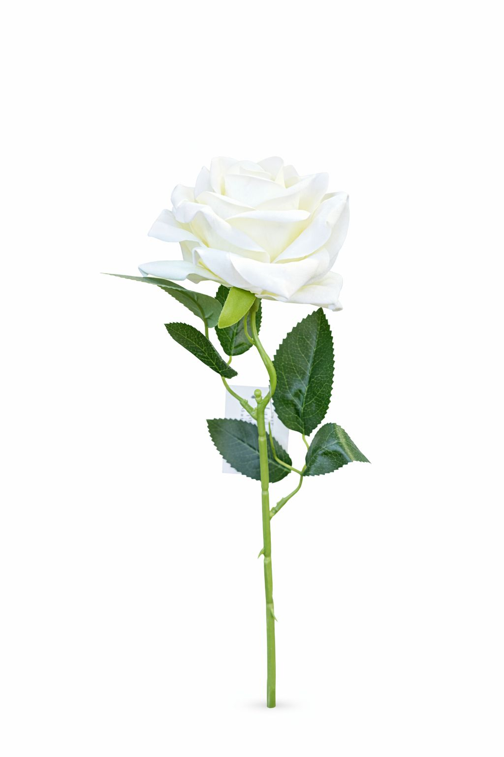 Trandafir artificial alb pur realizat din materiale de calitate superioara, cu petale catifelate fine ce imita fidel aspectul unei flori naturale. Floarea are un diametru de aproximativ 9 cm, iar firul masoara aproximativ 45 cm, fiind ideal pentru vaze, aranjamente florale sau decoruri elegante. Culoarea alb pur simbolizeaza puritatea, sinceritatea si eleganta atemporala, trandafirul fiind asociat cu frumusetea clasica si armonia. O alegere rafinata pentru decor interior, evenimente speciale sau cadouri de durata, fara necesitatea intretinerii.
