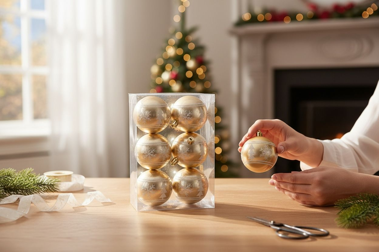 Set de 6 globuri elegante pentru bradul de Craciun, in nuanta rafinata auriu champagne. Realizate din material usor, rezistent, globurile au un design modern cu fulgi de zapada si braduti, perfect pentru un decor de sarbatoare luminos si armonios.
