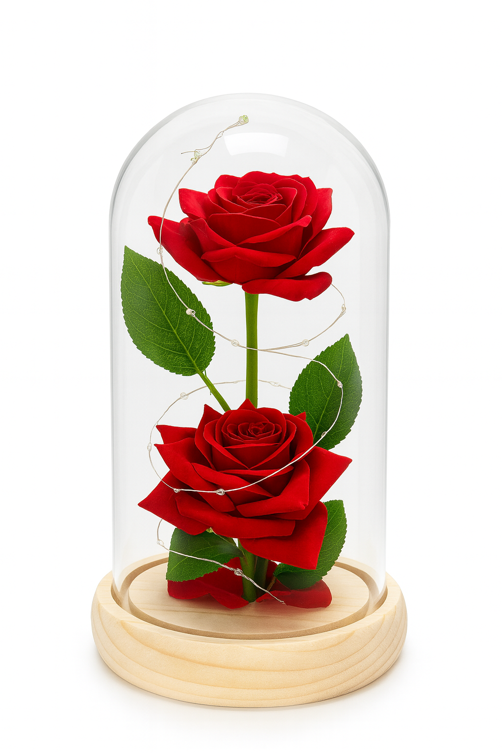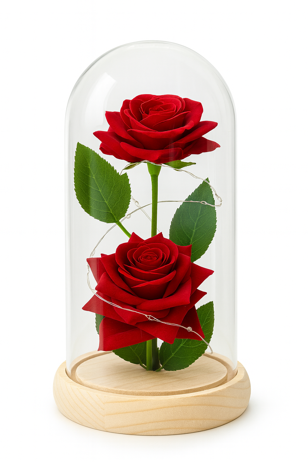 Ofera un cadou elegant, romantic si modern cu aceasta cupola premium ce contine doi trandafiri rosii din plastic, realizati cu un aspect realist si o intensitate vibranta a culorii. Aranjamentul este completat de lumini LED calde, care creeaza un efect spectaculos si transforma produsul intr-o piesa decorativa de exceptie.