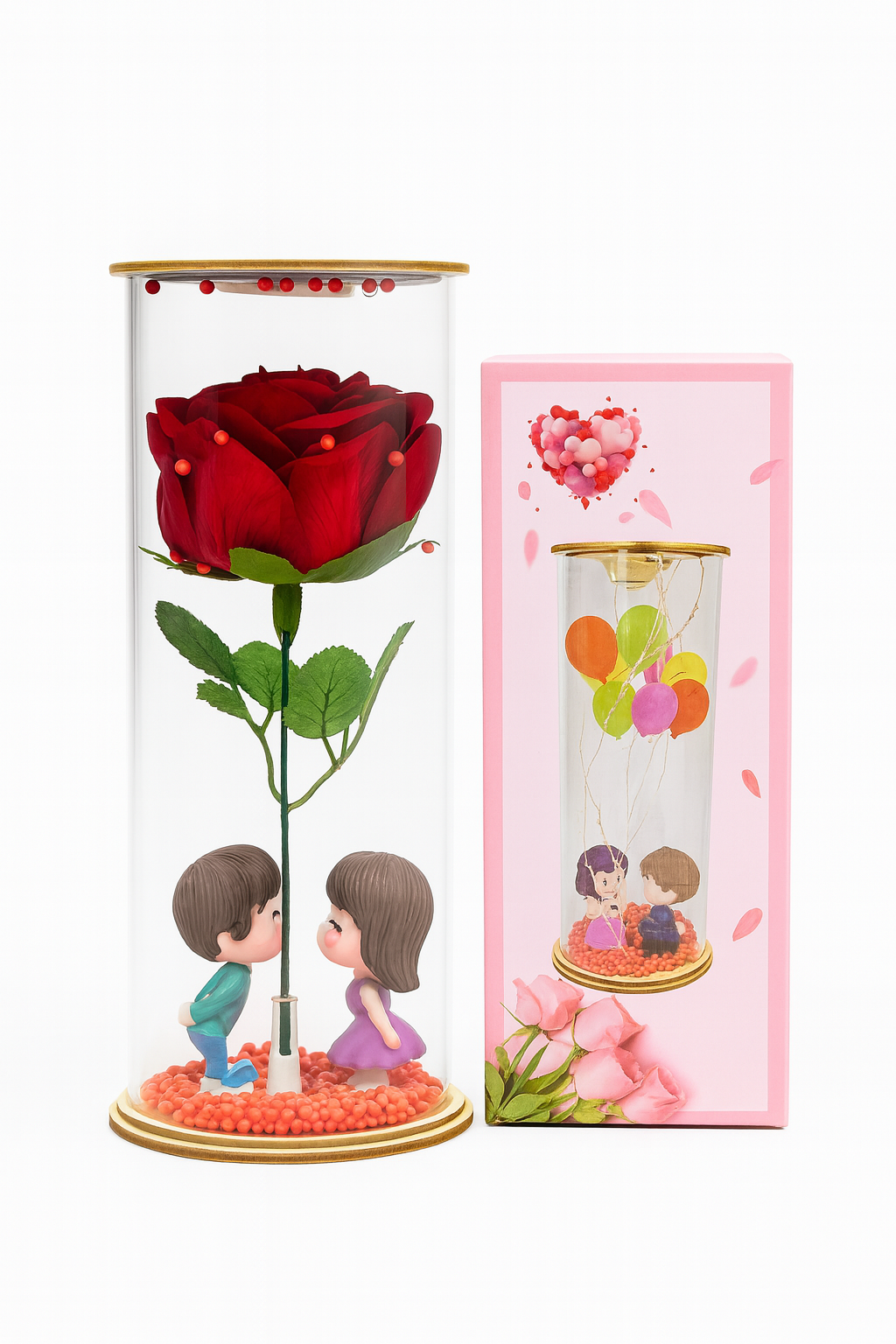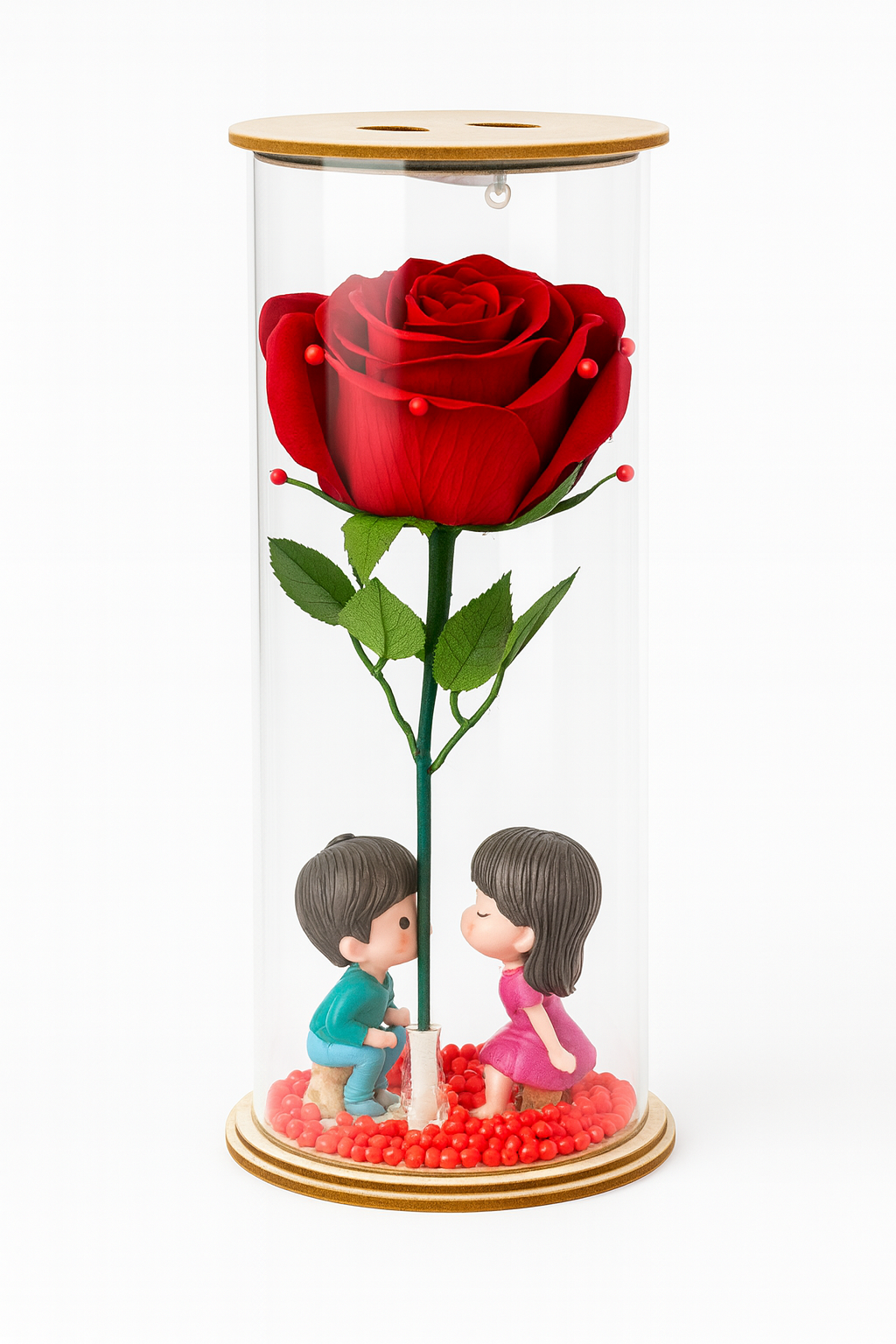 Trandafirul artificial este realizat din material premium, avand un aspect realist, cu petale atent finisate. Figurinele adauga un plus de emotie si delicatete, fiind perfecte pentru cadouri romantice. Cupola din sticla clara protejeaza aranjamentul, pastrandu-l impecabil in timp.