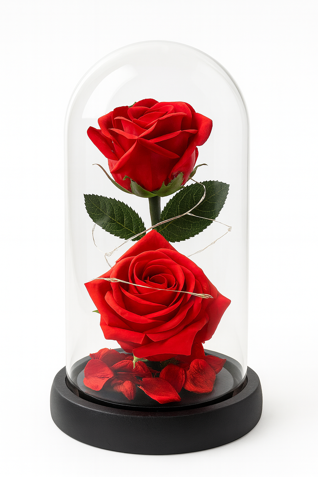 Ofera un cadou romantic, modern si elegant cu aceasta cupola din sticla ce adaposteste 2 trandafiri rosii din plastic, modelati cu atentie pentru un aspect realist si atragator. Luminile LED calde infasoara cele doua flori, creand o atmosfera delicata si plina de farmec, perfecta pentru Valentines Day, Martisor, 8 Martie, aniversari sau surprize romantice.