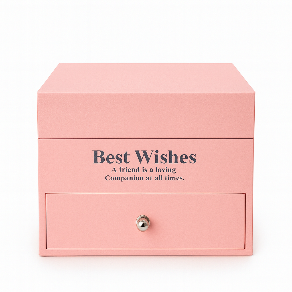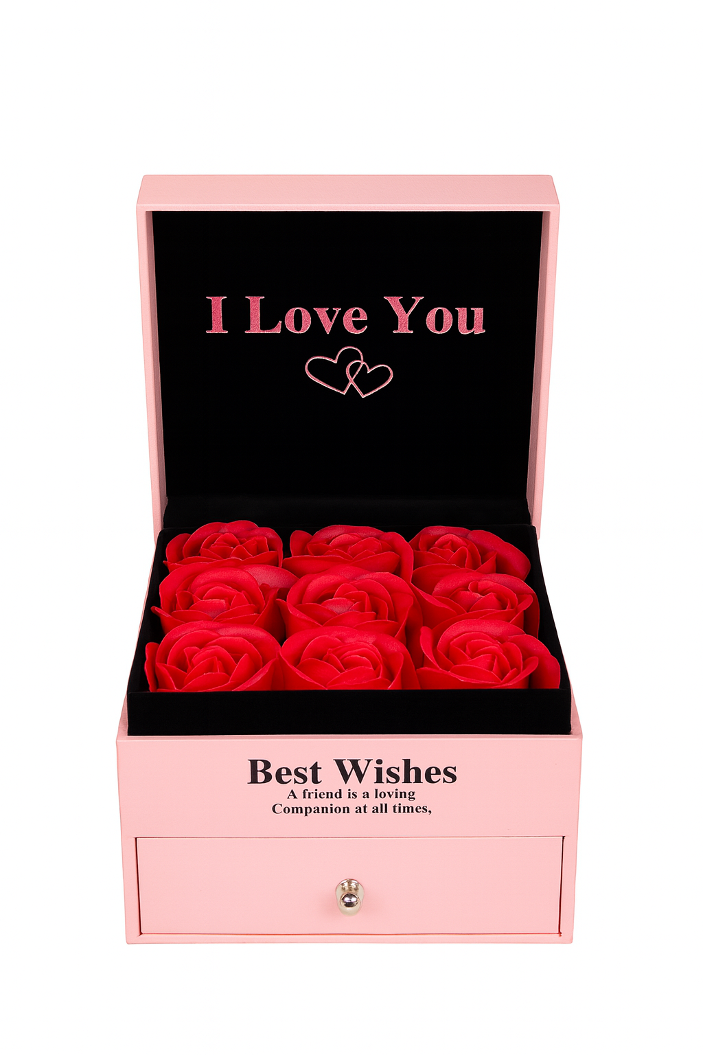 Cutia este realizata intr-o nuanta delicata de roz, cu interior negru, oferind un contrast elegant. Capacul interior este decorat cu mesajul „I Love You” si simboluri romantice, accentuand caracterul emotional al cadoului. Sertarul inferior ofera un spatiu suplimentar, ideal pentru a adauga bijuterii, bani, un mesaj personalizat sau alte mici surprize.