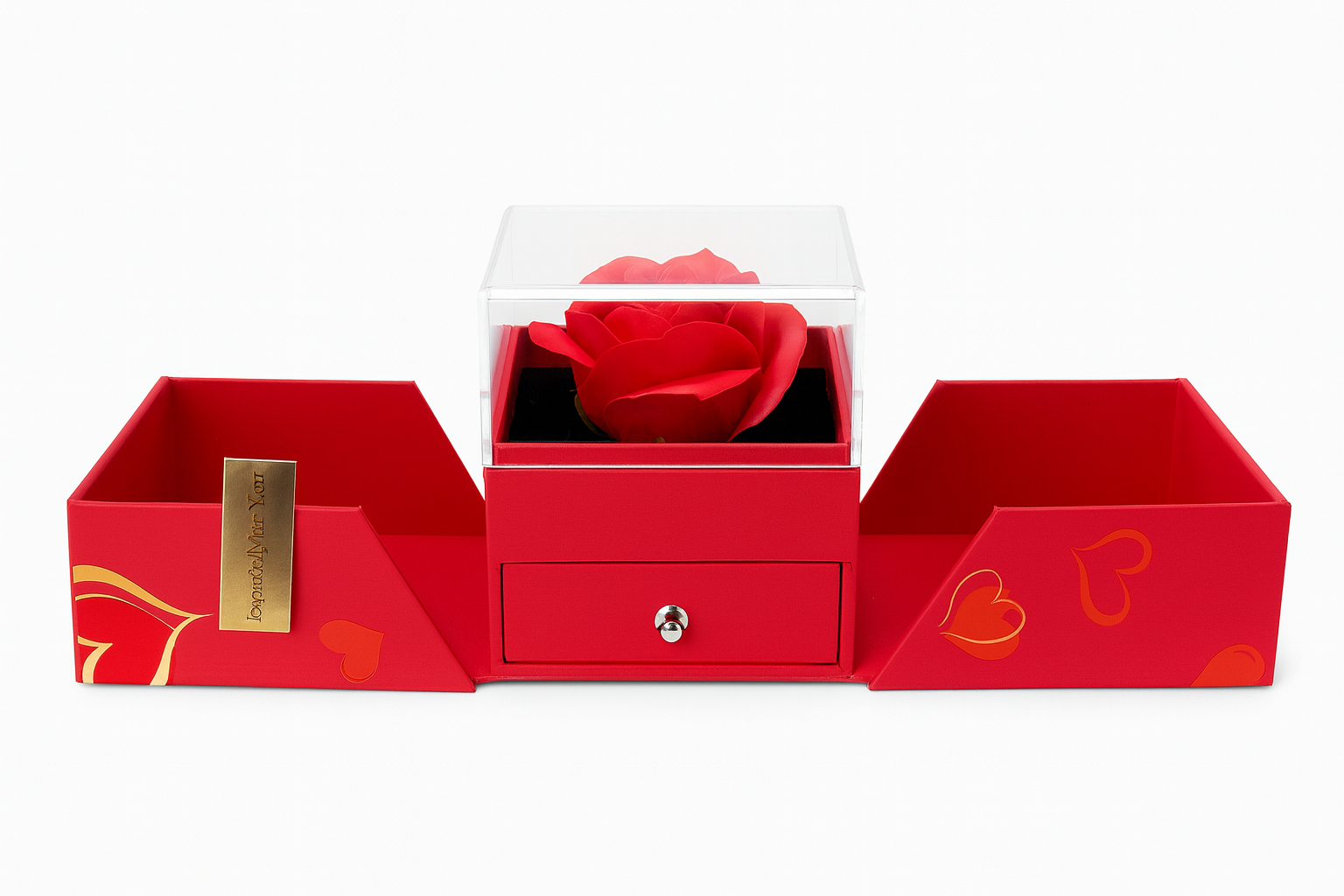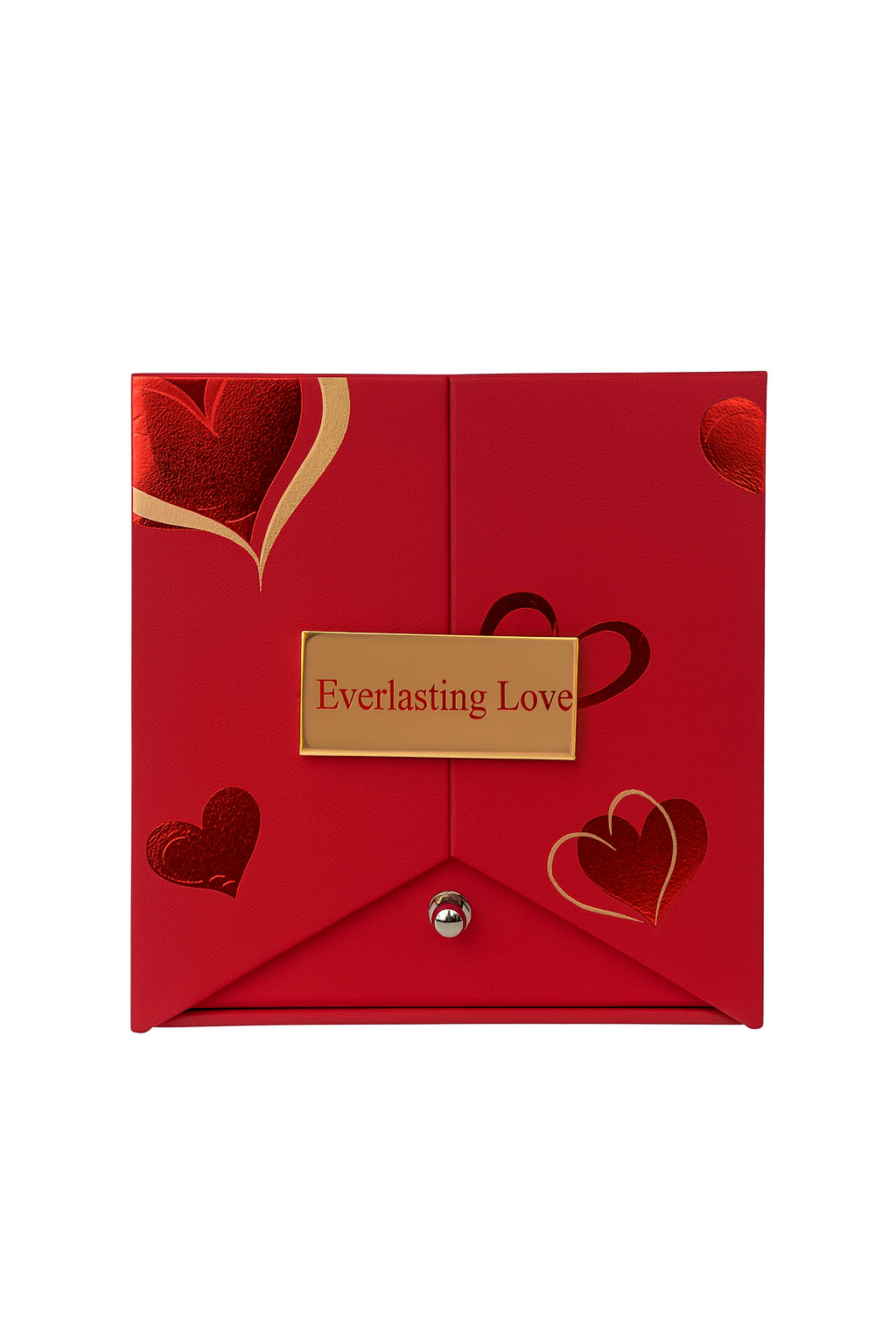 Cutia este realizata intr-o nuanta intensa de rosu, cu detalii decorative discrete in forma de inima, fiind conceputa pentru a transmite emotie si rafinament. Structura sa este una multifunctionala, prevazuta cu sertare laterale si un sertar inferior, ideale pentru depozitarea bijuteriilor, banilor, mesajelor personalizate sau a altor mici surprize.