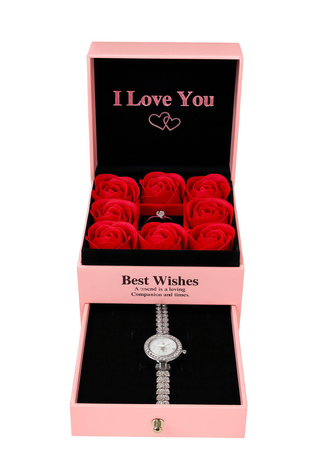 Sub aranjamentul cu trandafiri se gaseste un sertar glisant premium, captusit cu material elegant, in care este asezat un ceas de dama, cu un design feminin si detalii stralucitoare. Ceasul adauga un plus de valoare setului, completand perfect ideea unui cadou practic, dar in acelasi timp extrem de rafinat.