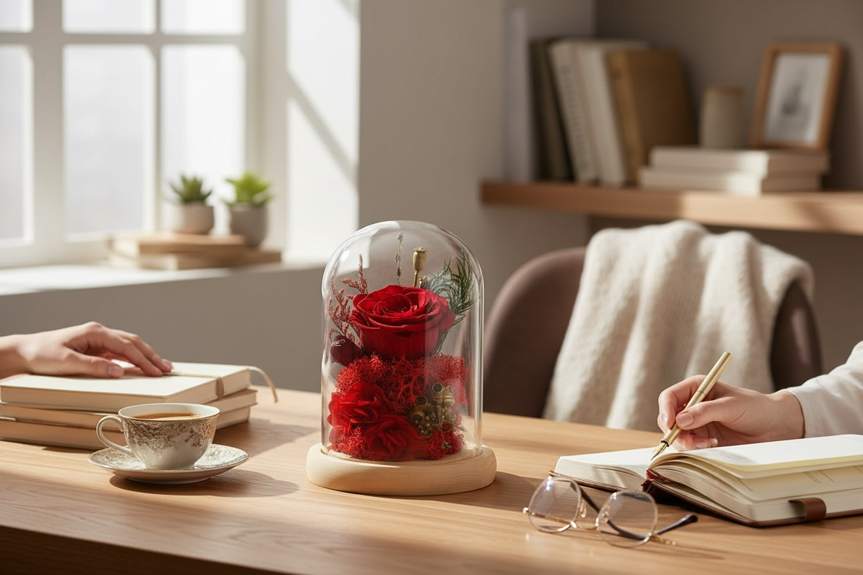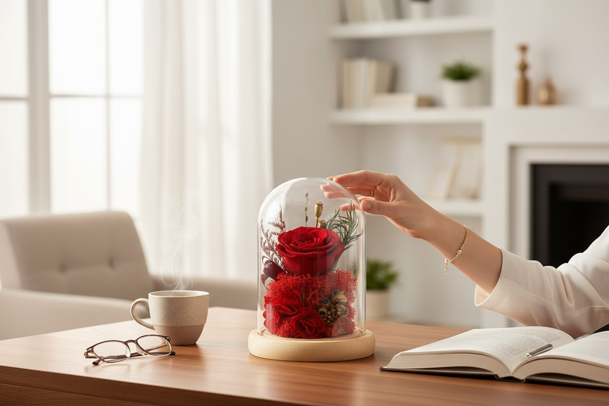 Aranjamentul este completat de un decor luxuriant: muschi stabilizat rosu, flori presate, ramuri naturale si accente aurii elegante, ce adauga profunzime si stralucire intregii compozitii. Cupola protejeaza perfect florile, oferind in acelasi timp un aspect modern si sofisticat, potrivit atat pentru casa, cat si pentru birou.