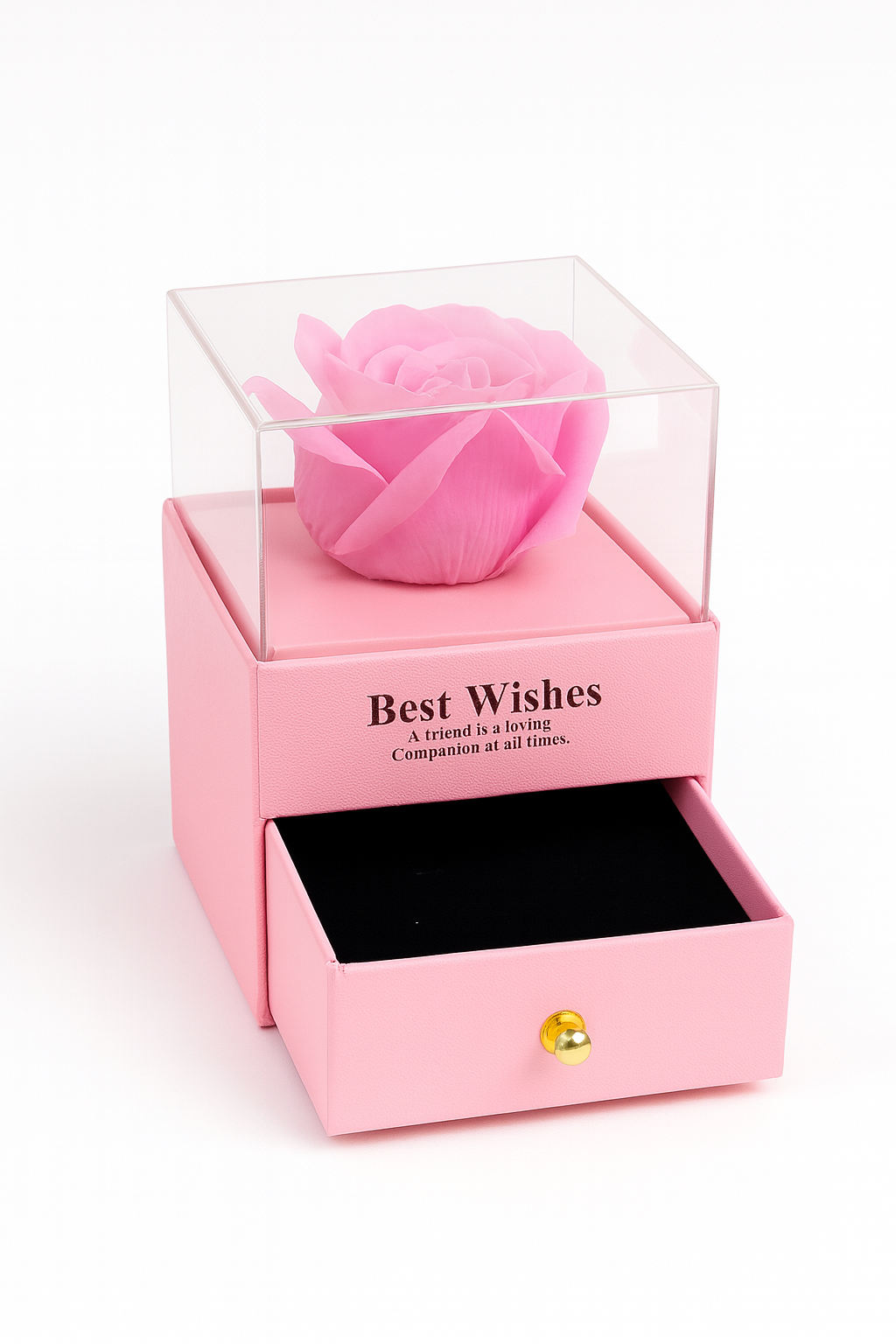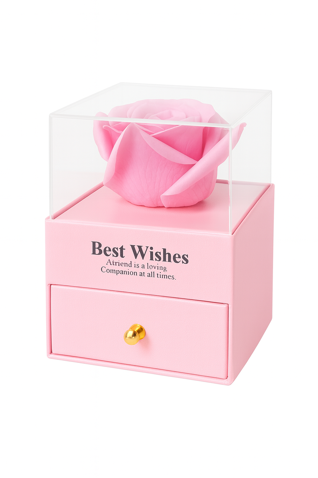 Cutia este realizata intr-un stil elegant, cu sertar functional, ideal pentru pastrarea bijuteriilor, mesajelor sau micilor obiecte personale. Deasupra, cupola transparenta protejeaza trandafirul si ii ofera un aer sofisticat, de piesa expusa intr-o vitrina de lux. Manerul metalic al sertarului completeaza perfect designul premium al produsului.