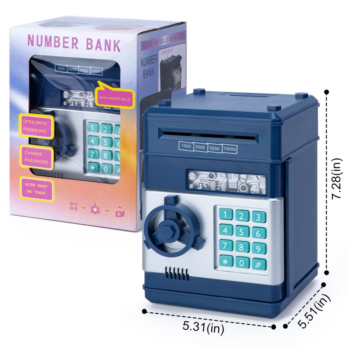 Seiful electronic pentru copii – varianta albastra – transforma economisirea intr-o activitate distractiva si educativa. Cu dimensiuni de 19x14 cm, acesta este suficient de compact pentru a fi asezat pe birou, dar indeajuns de incapator pentru a depozita monede si bancnote.