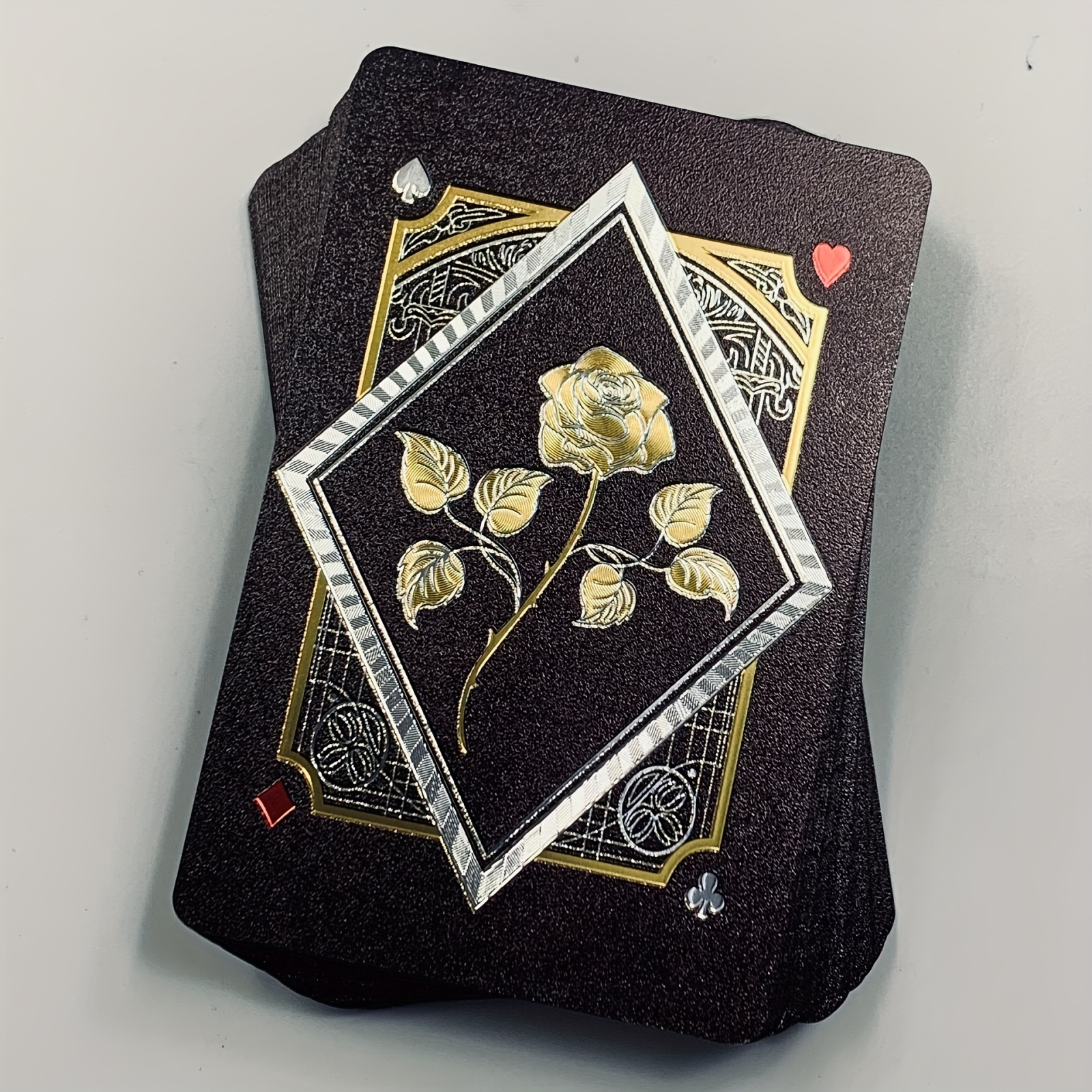 Transforma orice seara de joc intr-o experienta eleganta cu setul de carti de joc Black Gold Edition. Fiecare carte este realizata pe fundal negru mat, completata de simboluri si detalii aurii metalizate care ies in evidenta spectaculos. Designul rafinat cu model de trandafir pe cutie ofera un aspect luxos si misterios, perfect pentru pasionatii de poker si colectii premium.
