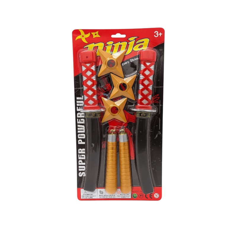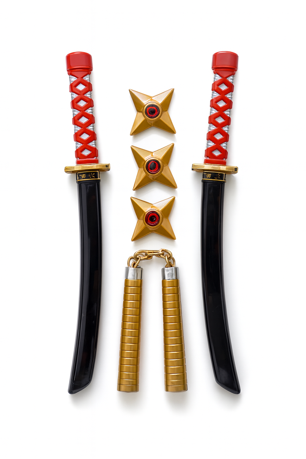 Acest set ninja complet este perfect pentru copiii pasionati de actiune, artele martiale si jocurile de rol. Cu doua sabii cu maner rosu, doua nunchaku aurii si trei stele ninja, cei mici pot crea propriile aventuri pline de adrenalina.