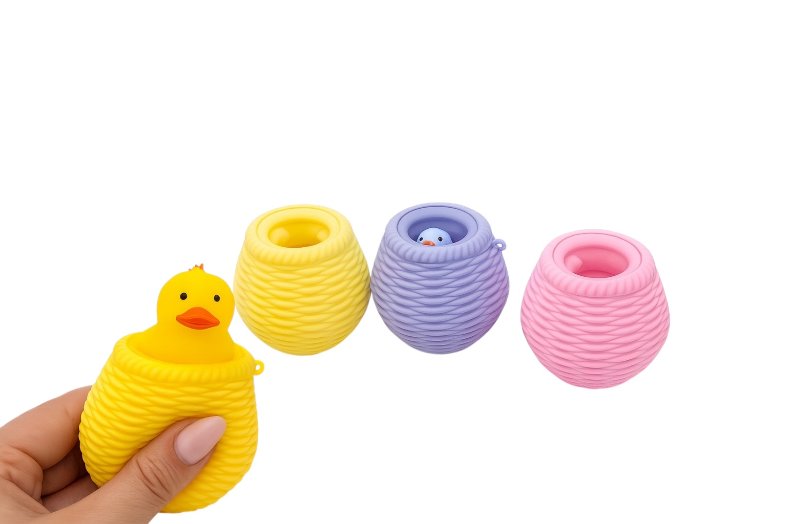 Setul de 12 jucarii tip „Rata ascunsa in cosulet” este perfect pentru copii, fiind realizat din silicon moale, usor de strans, modelat si comprimat. Fiecare cosulet are un design texturat tip impletitura si ascunde in interior o mica rata adorabila, care iese la apasare si revine in interior ca o jucarie antistres.