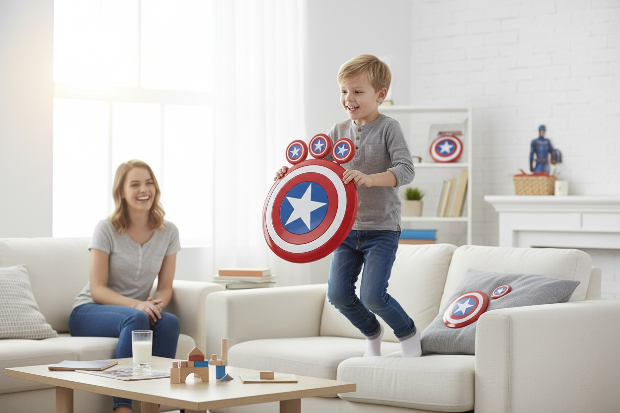 Acest set inspirat din universul supereroilor este perfect pentru copiii care adora aventura, actiunea si jocurile de rol! Include un scut rotund in culori rosu-albastru cu steluța emblematica si patru discuri aruncatoare asortate, ideale pentru a recrea scene heroice sau misiuni de protectie.