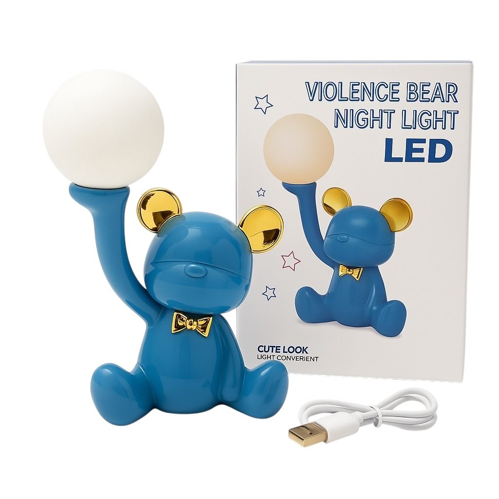 Lampa de veghe LED in forma de urs albastru este accesoriul perfect pentru camera copiilor, oferind o lumina calda, lina si reconfortanta pe timpul noptii. Designul sau modern, cu urechi aurii si glob luminos sustinut in mana, aduce un plus de stil si veselie oricarui spatiu, fiind ideala pentru noptiere, birouri sau zone de relaxare.