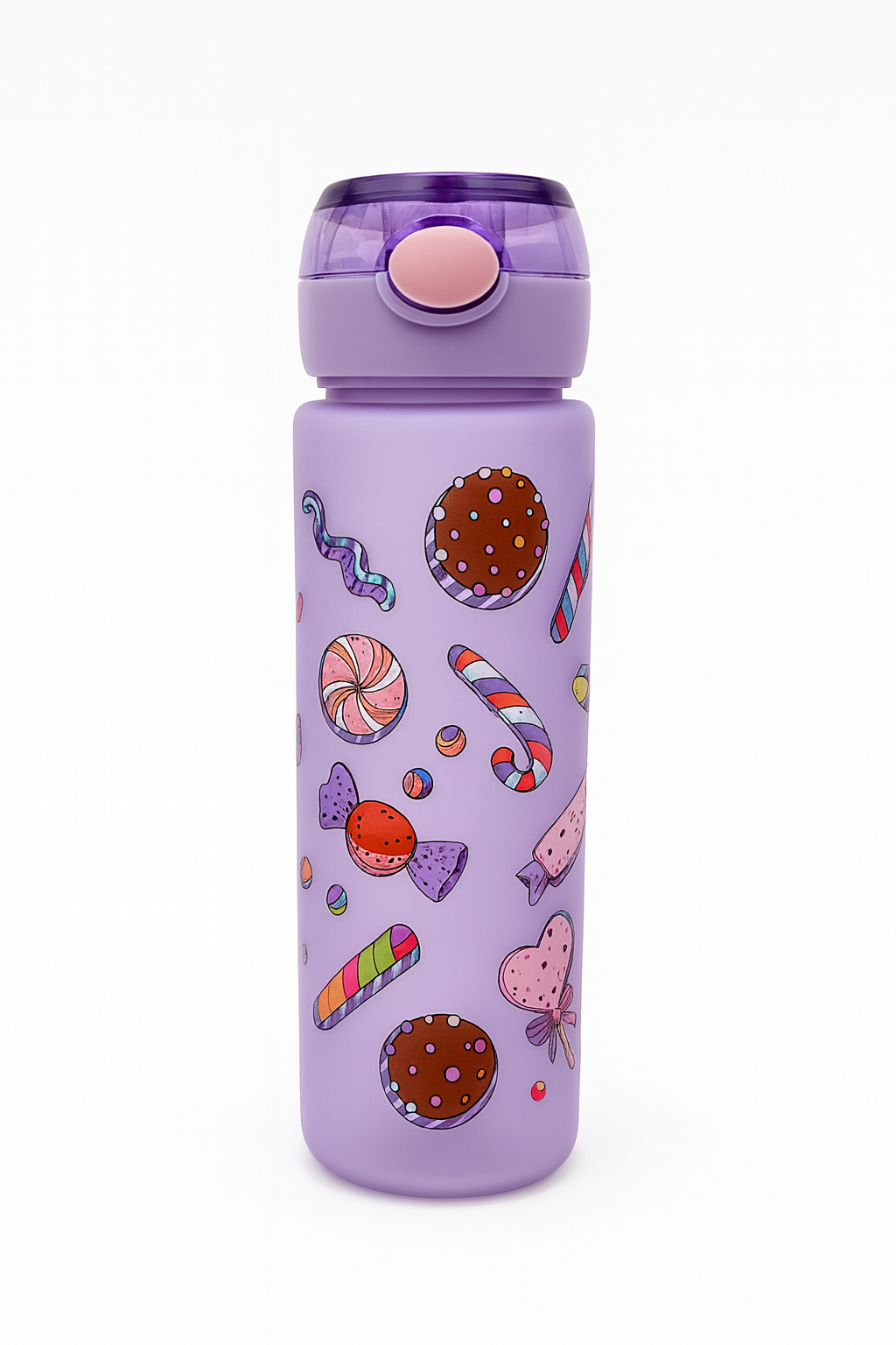 Sticla Kids Candy Purple 500ml este alegerea perfecta pentru copiii care iubesc culorile vii si obiectele pline de personalitate. Cu un design adorabil in nuante pastel de mov si ilustratii jucause inspirate din lumea dulciurilor – acadele, bomboane, biscuiti si jeleuri – aceasta sticla transforma hidratarea intr-o experienta distractiva si atragatoare pentru cei mici. Fiecare detaliu este gandit pentru a incuraja consumul regulat de apa intr-un mod amuzant si creativ.