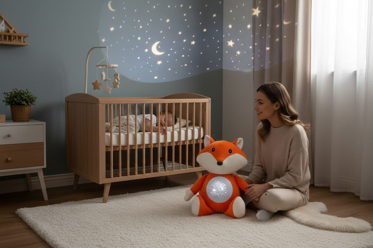 Ofera-i micutului tau o atmosfera magica inainte de somn cu aceasta adorabila jucarie de plus in forma de vulpe, dotata cu proiector de lumini si melodii calmante. Conceputa special pentru bebelusi, vulpita lumineaza tavanul si peretii cu stelute, luni si forme relaxante, creand un mediu linistit si sigur pentru somn.