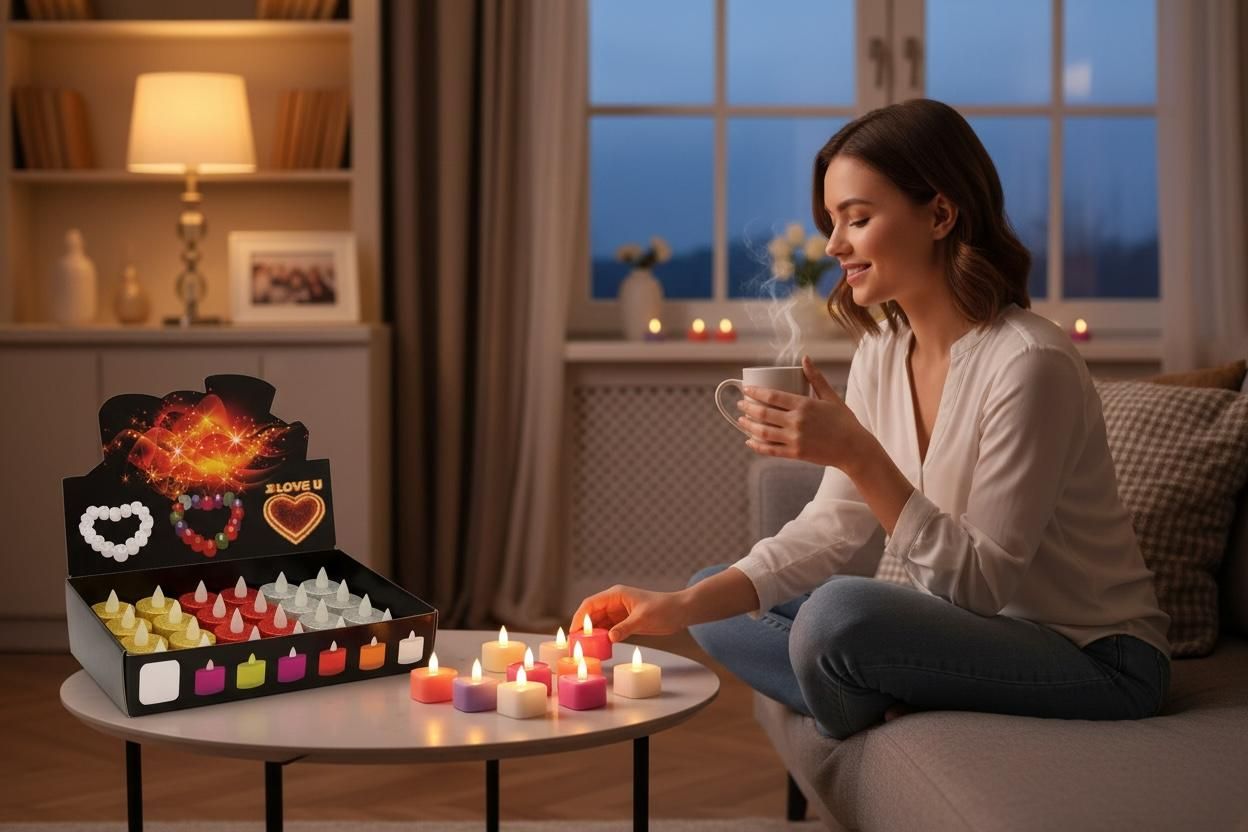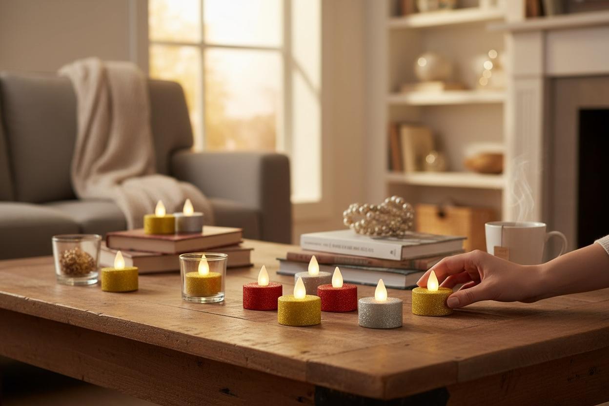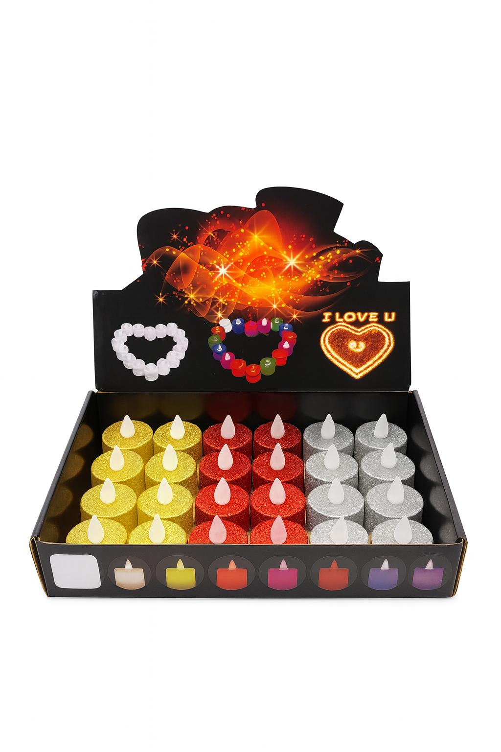 Lumanare decorativa LED tip pastila, acoperita cu glitter fin pentru un efect elegant si festiv. Este ideala pentru decorul de sarbatori, cine romantice, evenimente sau pentru a crea jocuri de lumini sub forma de inimioare sau mesaje.