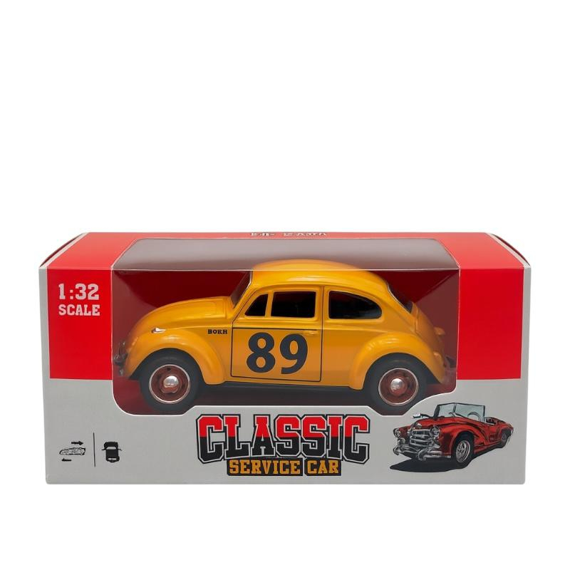 Descopera o masinuta metalica clasica tip Beetle (sau "Broscuta"), ideala pentru colectionari sau pentru joaca copiilor de peste 3 ani. Fabricata prin tehnologia Die-Cast (caroserie metalica si baza/interior plastic), masinuta este robusta si detaliata, oferind o experienta realista. Modelul din imagine este disponibil in culoarea galben cu detalii negre/rosii si numarul "89" imprimat pe portiera. Jucaria este prevazuta cu miscare prin frictiune (pull-back drive): trage-o inapoi pe podea, elibereaza-o si priveste cum accelereaza singura. Mecanismul simplu nu necesita baterii pentru deplasare. Designul autentic, retro, cu roti clasice, o face o piesa atractiva atat pentru joaca, cat si pentru expunere, fiind numita un "Classic Service Car" pe ambalaj.