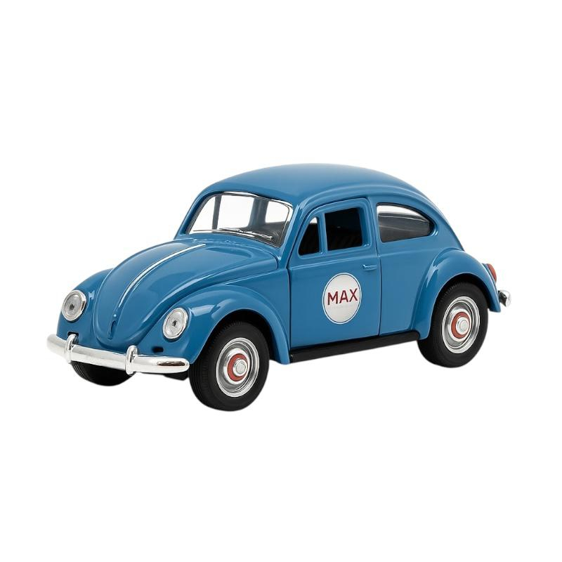 Descopera o masinuta metalica clasica tip Volkswagen Beetle (sau "Broscuta"), ideala pentru colectionari sau pentru joaca copiilor de peste 3 ani. Fabricata prin tehnologia Die-Cast (caroserie metalica si baza/interior plastic), masinuta este robusta si detaliata, oferind o experienta realista. Modelul din imagine este disponibil in culoarea albastru cu detalii rosii si inscrisul "MAX" pe portiera.