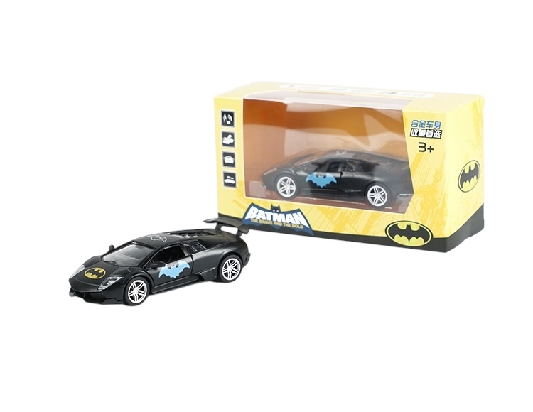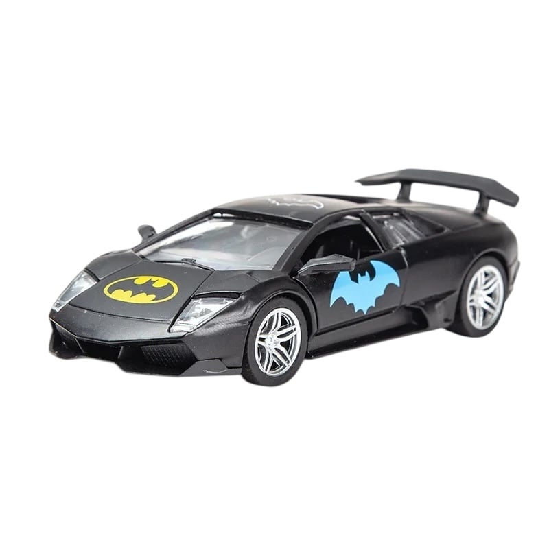 Aceasta masinuta metalica sport pentru copii este realizata la scara mica, avand dimensiunea de 19x10 cm si un design modern, inspirat din universul eroilor. Modelul este vopsit in negru cu detalii colorate si dispune de roti mobile, oferind o experienta de joaca placuta si realista.