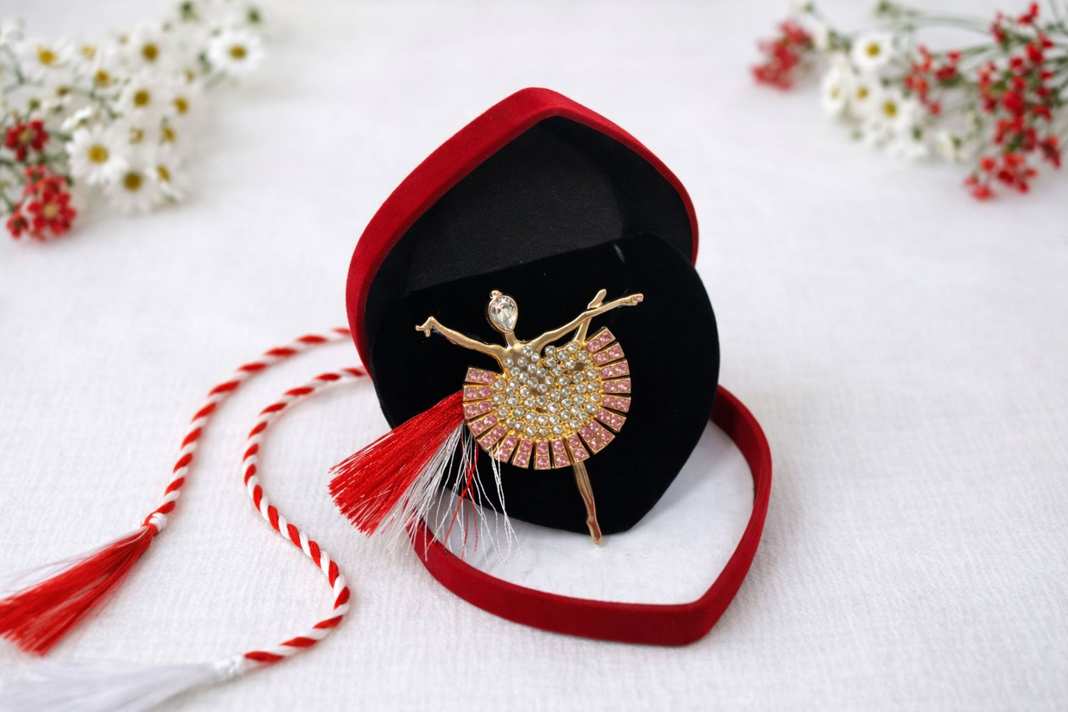 Brosa eleganta in forma de balerina, realizata in nuanta aurie si decorata cu strasuri albe stralucitoare si accente roz delicate, care ofera un aspect rafinat, feminin si armonios. Designul balerinei simbolizeaza gratie, eleganta si sensibilitate artistica, fiind un cadou potrivit pentru persoanele care apreciaza frumusetea detaliilor fine. Combinatia de alb si roz sugereaza puritate, afectiune si rafinament, fiind ideala pentru martisor sau ocazii speciale de primavara. Brosa este prezentata intr-o cutie din catifea rosie, in forma de inima, cu interior negru, care pune in valoare bijuteria si ii confera un aer premium. Martisorul traditional alb rosu cu ciucure este inclus, completand simbolistica norocului si a inceputului de sezon.