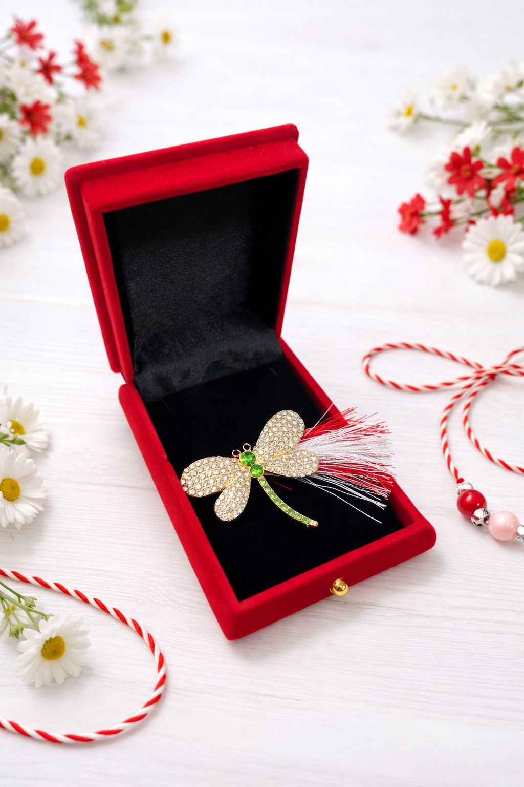 Brosa eleganta in forma de libelula, realizata in nuanta aurie si decorata cu strasuri albe stralucitoare si accente verzi intense, care ofera un aspect rafinat si plin de luminozitate. Libelula este un simbol al transformarii, norocului si echilibrului, fiind un martisor cu semnificatie speciala si design atemporal. Detaliile atent finisate pun in valoare contrastul cromatic si confera bijuteriei un aer premium, potrivit pentru tinute elegante sau pentru a fi oferita cadou. Brosa este prezentata intr-o cutie deosebita din catifea rosie, cu interior negru, in forma de cufar, avand un model reliefat pe partea superioara care completeaza prezentarea sofisticata. Martisorul traditional alb rosu cu ciucure este inclus. Dimensiunile cutiei sunt 9 x 7 x 3.5 cm, ideale pentru oferire cadou si pastrare in siguranta.