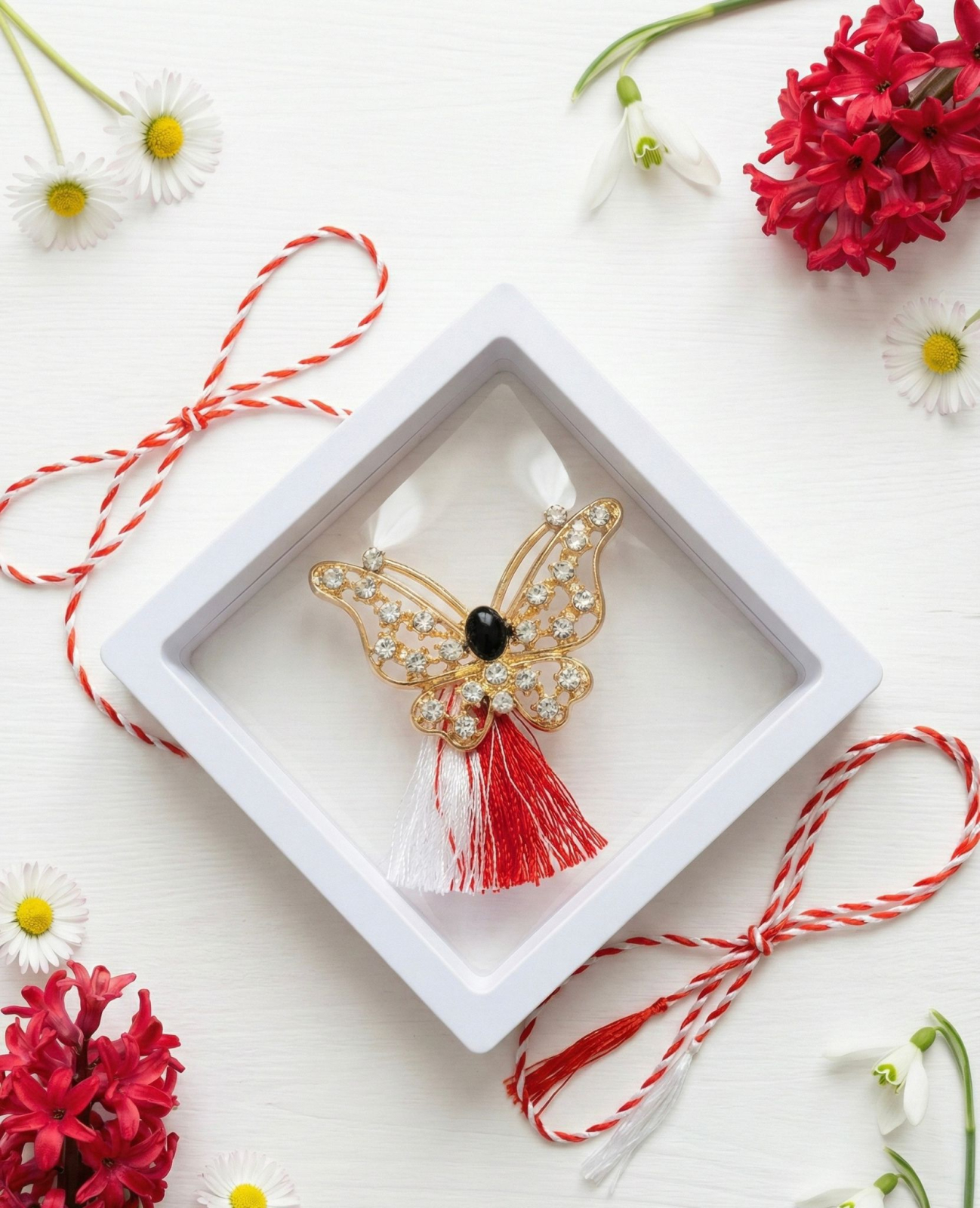 Cutia generoasa de 9x9 cm ofera o nota de distinctie darului tau, punand in valoare calitatea metalului si finisajele deosebite ale acestui fluture de martie.