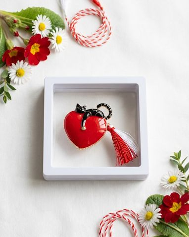 Ofera un martisor plin de farmec cu aceasta brosa Martisor 5 cm, Inima cu pisica. Combinatia dintre simbolul afectiunii si silueta gratioasa a pisicii creeaza un accesoriu modern si chic, potrivit pentru a fi purtat intreaga luna martie.