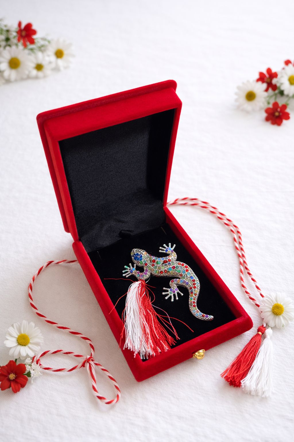 Brosa stilizata in forma de soparla, realizata in finisaj argintiu si decorata cu strasuri multicolore atent montate, ce ofera un efect vizual vibrant si modern. Designul simbolizeaza adaptabilitatea, energia si norocul, fiind un accesoriu deosebit pentru tinute elegante sau casual chic. Brosa este prezentata intr-o cutie de catifea rosie tip cufar, cu textura reliefata pe partea superioara si interior negru, ideala pentru pastrare sau oferire cadou. Dimensiunile compacte ale cutiei o fac usor de depozitat si perfecta pentru ocazii speciale precum martisor, aniversari sau cadouri simbolice.