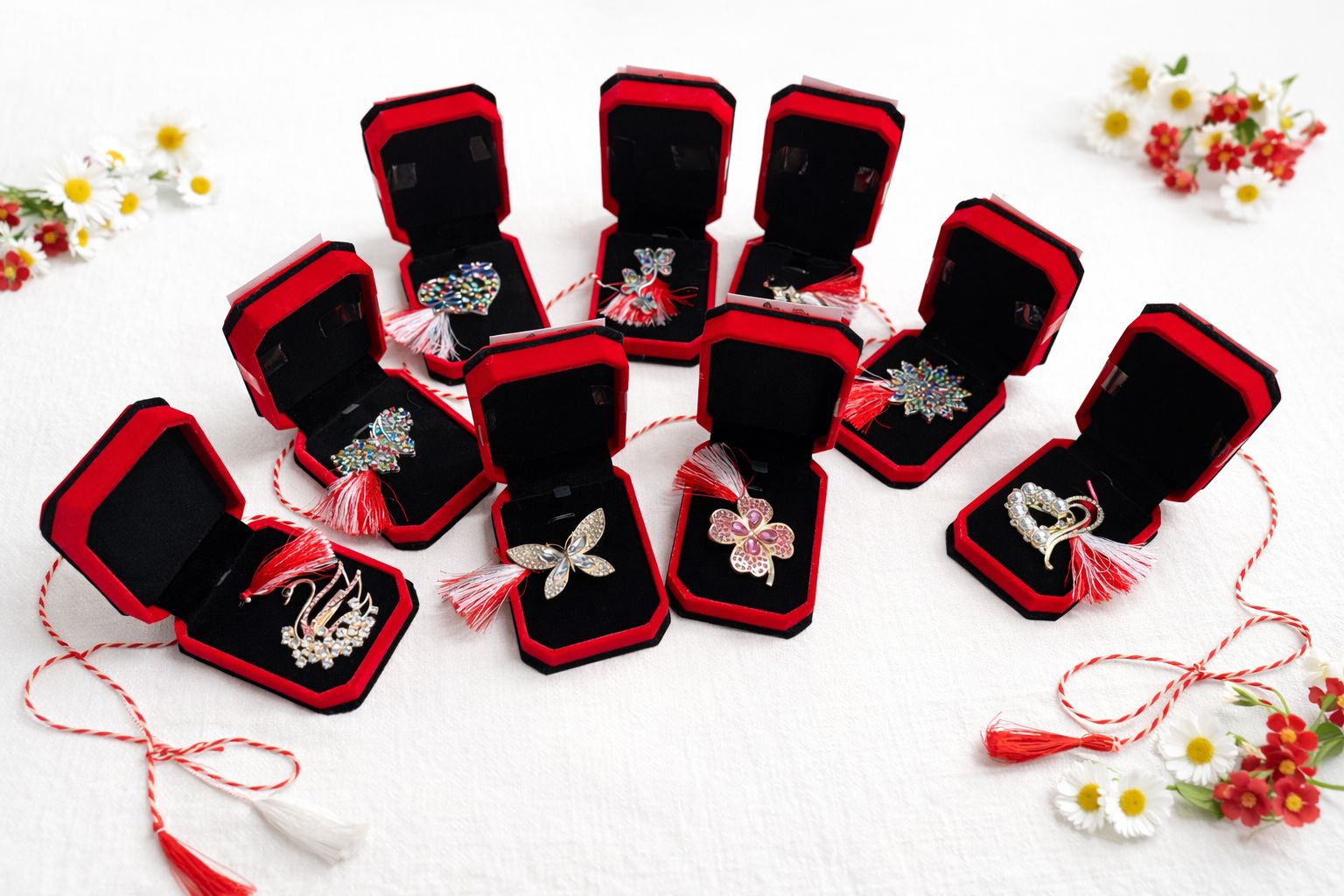 Brosele sunt realizate cu atentie la detalii, avand un aspect delicat si feminin, potrivit atat pentru tinute casual, cat si pentru cele elegante. Fiecare piesa este ambalata individual intr-o cutie rosie eleganta, completata cu snur traditional alb-rosu, ceea ce le face ideale pentru a fi oferite cadou fara alte pregatiri suplimentare.