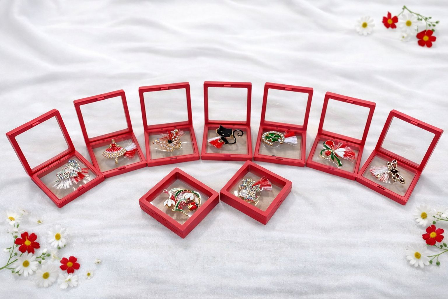 Fiecare brosa este ambalata individual intr-o cutie rosie eleganta, cu capac transparent, care permite vizualizarea produsului fara deschidere. Interiorul protejeaza brosa si evidentiaza designul acesteia, iar snurul traditional alb-rosu completeaza simbolistica martisorului. Ambalajul modern face ca acest set sa fie gata de oferit, fara ambalare suplimentara.