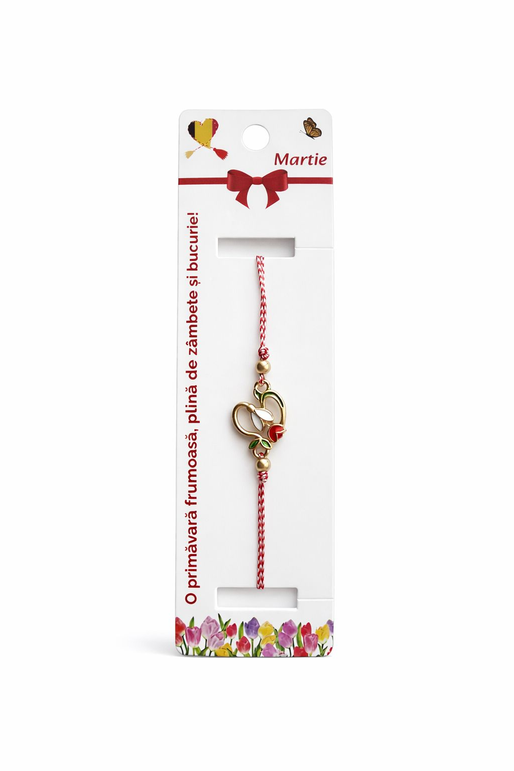 Setul contine 12 martisoare tip bratara, perfecte pentru a celebra venirea primaverii cu un gest de eleganta si traditie. Fiecare bratara are un snur reglabil in culorile traditionale alb cu rosu, specific martisorului romanesc, si un pandantiv auriu rafinat care infatiseaza un boboc de ghiocel stilizat, cu o mica pietricica rosie stralucitoare.