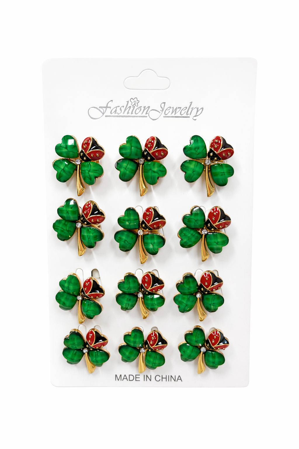 Set 12 brose Martisor pe carton prezentare, 17x10 cm, Cadou 1 Martie, Trifoi norocos cu Buburuza