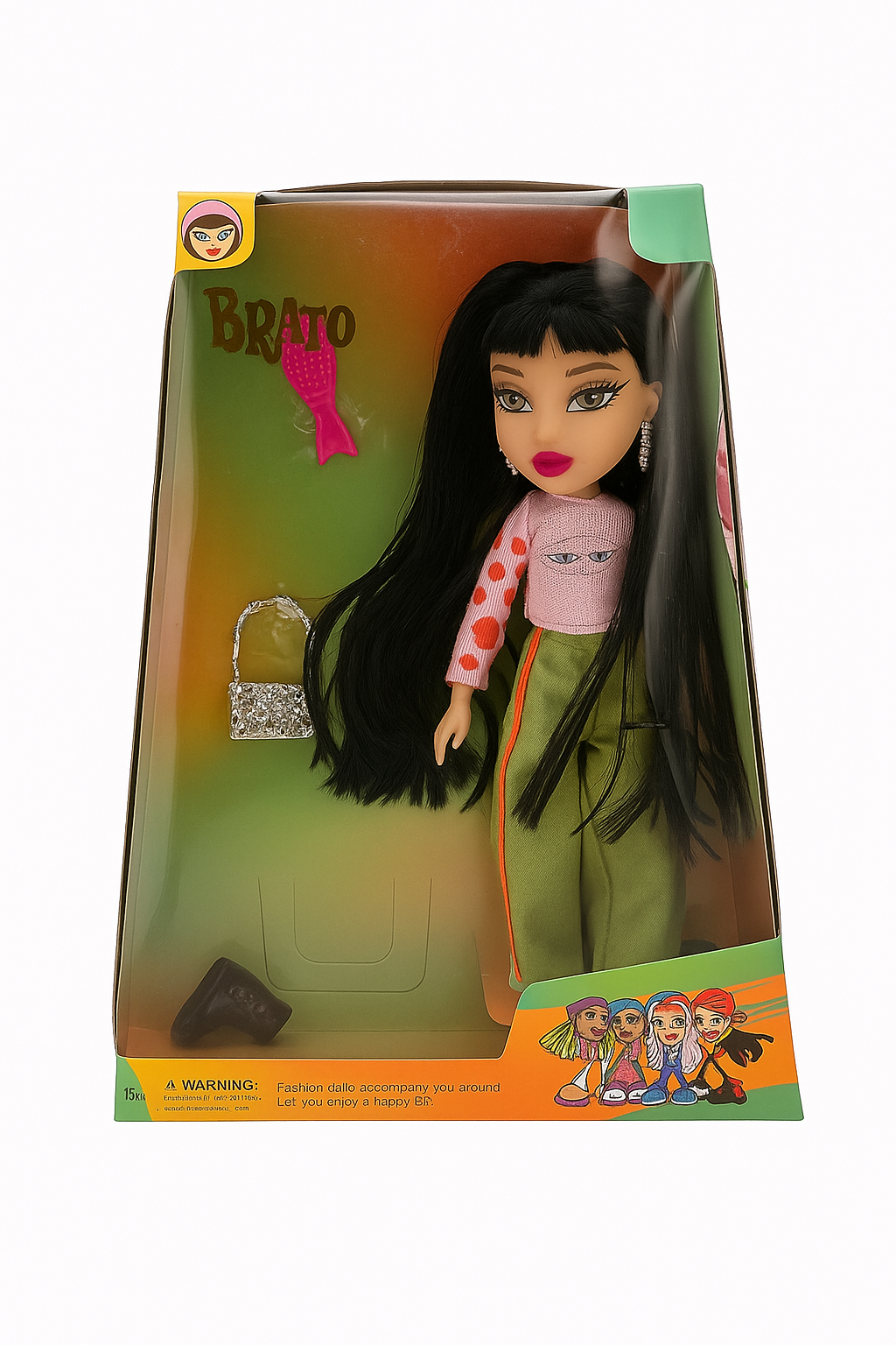 Papusa Brato Fashion impresionează printr-un look urban-chic plin de personalitate! Poartă o bluză roz cu imprimeu modern și mâneci cu buline, perfect asortată cu pantalonii verzi cu banda laterală portocalie – o combinație cool, inspirată din moda de stradă. Parul ei foarte lung și negru intens permite coafuri spectaculoase și ore întregi de joacă creativă.