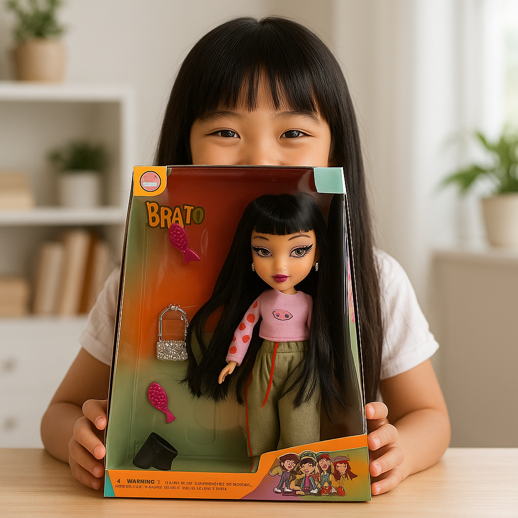 Recomandată copiilor de 3+ ani, papusa Brato încurajează creativitatea, expresivitatea și pasiunea pentru modă.