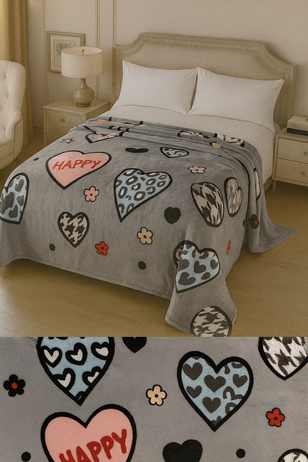 Designul este compus din inimioare mari si mici, cu imprimeuri variate: modele leopard, inimioare simple, inimioare conturate sau umplute cu motive decorative. Pe fundalul gri, aceste elemente colorate in nuante de albastru, crem, negru si rosu ies in evidenta si creeaza un aspect jucaus. Mesajul decorativ "HAPPY" adauga un accent optimist, potrivit in special pentru dormitoarele tinere, moderne sau pentru camerele adolescentilor.