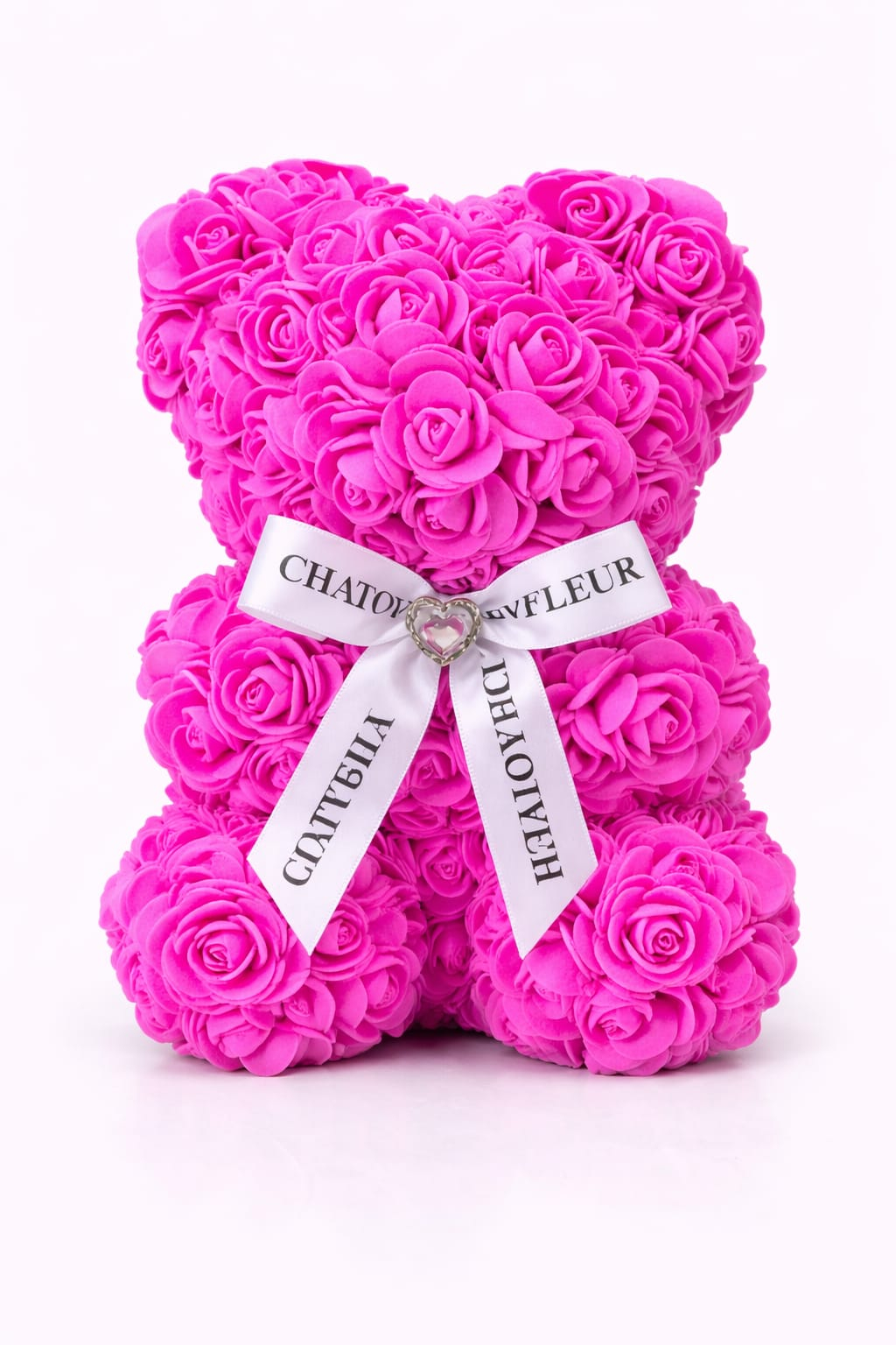 Ursul este accesorizat cu o funda decorativa alba, prevazuta cu un element central stralucitor, care completeaza designul rafinat al produsului. Trandafirii artificiali isi pastreaza forma si culoarea fara a necesita intretinere.