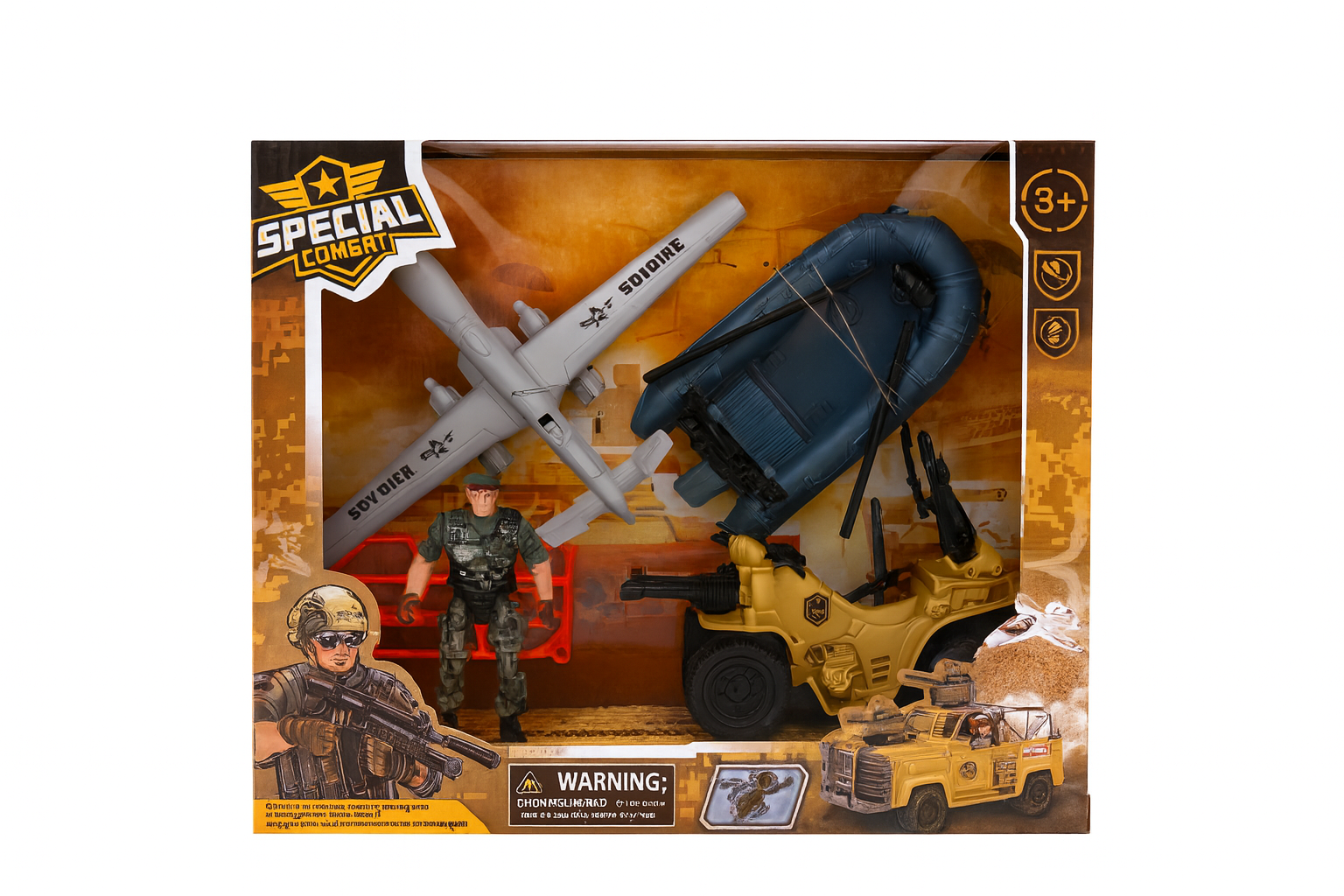 Transforma joaca intr-o misiune speciala cu setul Special Combat, un kit complet pentru micii aventurieri pasionati de actiune, armata si operatiuni tactice. Acest set include un avion militar, o barca gonflabila, un vehicul tactic si o figurina soldat articulata – tot ce trebuie pentru scenarii pline de aventura.